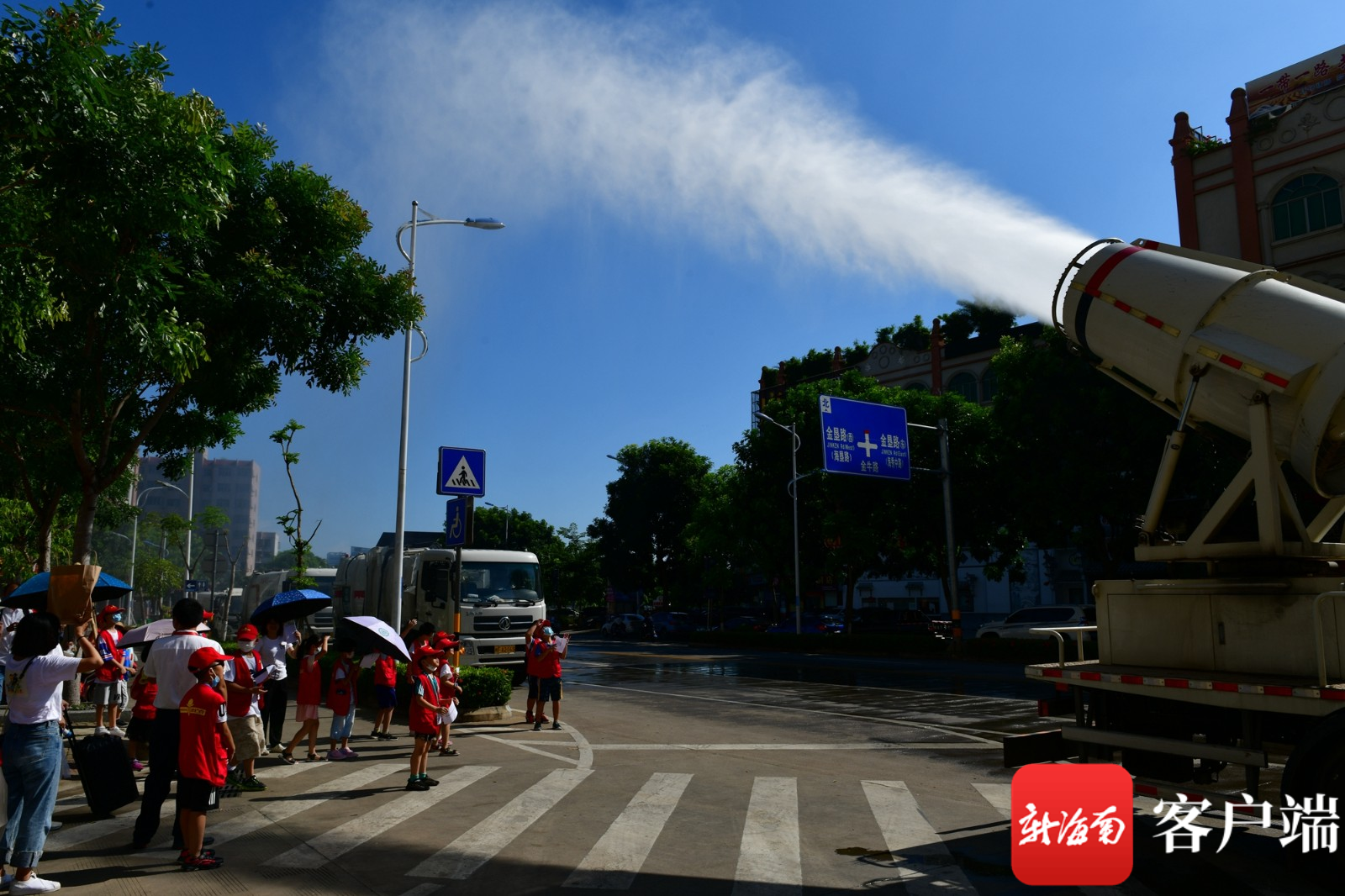 “這叫抑塵車呀,它可以噴射又長又大的水霧帶,把空氣中的塵埃等顆粒物附著,在水霧的重力下掉落地面,起到很好的清潔空氣作用。”龍馬環衛工作人員現場給小記者們講解,“炮筒”可以左右,上下旋轉,水箱里有8噸水,并讓司機師傅開機演示。只見,圓筒風扇轉起來,在高壓機把水壓成水霧后,風扇吹出了又長又大的水霧帶,天空仿佛下起了綿綿細雨。小記者們發現,隨著大圓筒轉向,他們看到了陽光下水霧帶里有彩虹出現,很快周邊的空氣變得涼爽清新。