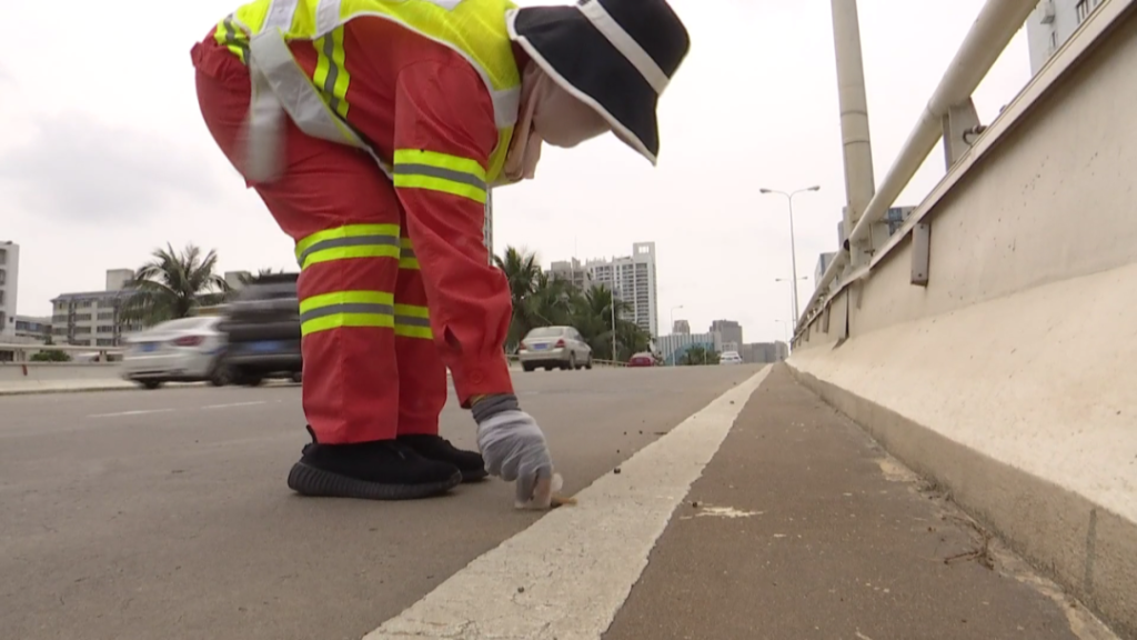 垃圾太多,范圍太大的話,我們才用掃帚,一般都是拿手來撿,車流太多,馬上撿了,馬上就要走,不能在橋上停留。