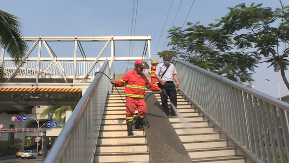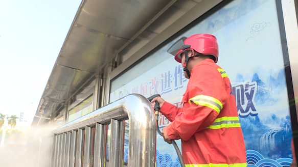 在南海大道城西高鐵站附近,海口龍馬環衛三片區的環衛工人們正在開展過街天橋的清洗工作。一名工人手持高壓水槍,將天橋的欄桿以及扶手清洗一遍,另一名工人用抹布將水漬擦干,分工明確,忙而不亂。不遠處的公交站附近,還有工人們正在對站臺和站牌進行清洗。
