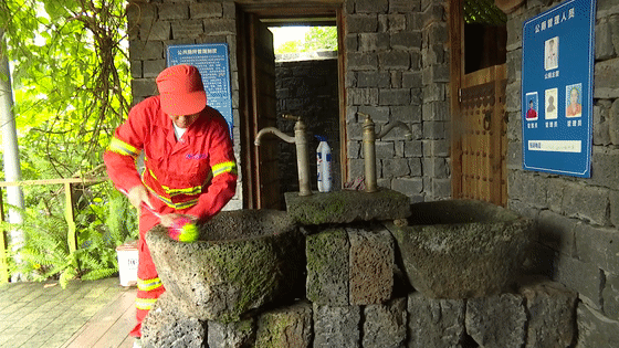 環(huán)衛(wèi)工人梁麗南每天駐守在新坡鎮(zhèn)仁里村公廁,清掃、擦洗、除味、消毒,一樣都不能少。公廁門口的洗手池、臺面都取材自當?shù)氐幕鹕绞庥^樣式獨特,但也給清潔工作增加了麻煩。