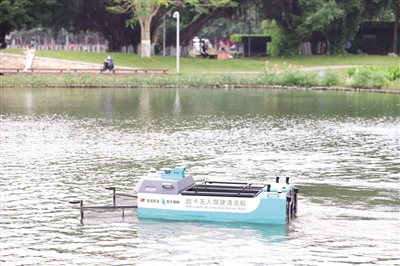 昨日下午,我省首艘無人駕駛清潔船(學名“水面智能機器人”)亮相海口東、西湖,正式開展水面作業,吸引眾多市民駐足觀看。