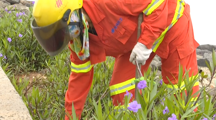 蔡金花是??邶堮R環衛公司的一名環衛工人,她負責在花草叢里挑揀垃圾。有些垃圾是隱身在石頭縫里,有些躲在花叢里,非??简炑哿?。