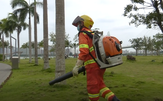 ??跒炒笃牟莸厥黔h衛工人的重點工作區域在,這里的衛生問題主要是清掃落葉。對待這些“不聽話”的;落葉,環衛工人已掌握了一套高效率的清潔方式,就是使用吹風機。順著風的方向集中吹到一個點位,再進行統一清掃。這些吹風機用起來順手,但背在身上著實費力,重重足足有四五十斤。