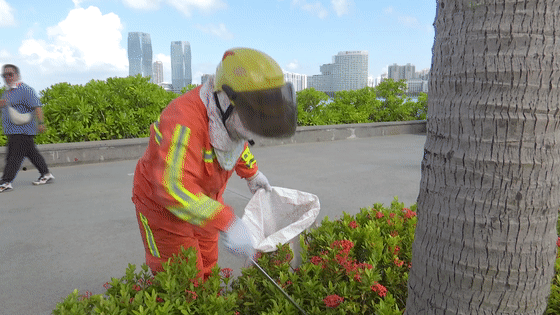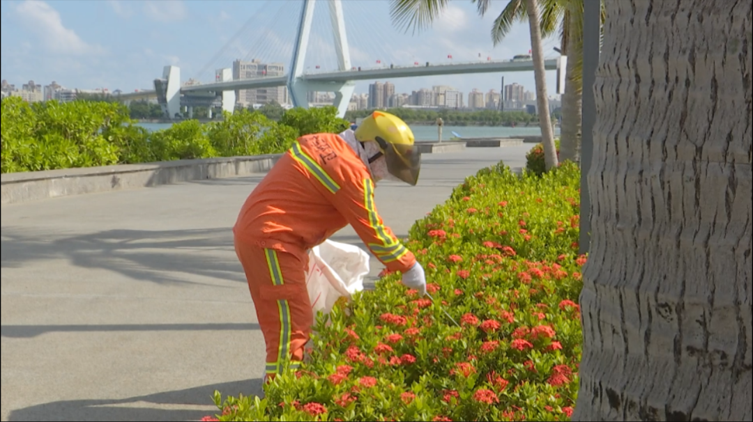 張敏負責海口灣云洞周邊區域的保潔工作,一大早,張敏就來到保潔路段,開始了一天的忙碌,撿拾綠化帶的各類垃圾,一遍遍篩查,不放過任何一個死角。