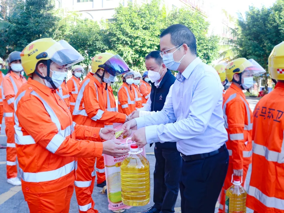 2023年1月14日上午,在新春佳節即將到來之際,海口市綜合行政執法局龍華分局局長聶增詠帶領龍華區環衛局局長吳雷、福龍馬海口公司常務副總經理黃彪、副總經理邢益芳、廖萬凱、督查總監陳偉等領導一行,開展春節慰問一線環衛工人活動,表達了黨和政府以及公司工會組織對一線工人的關懷,并送去米、油慰問品,向他們致以節日的問候和祝福。