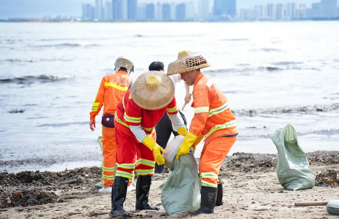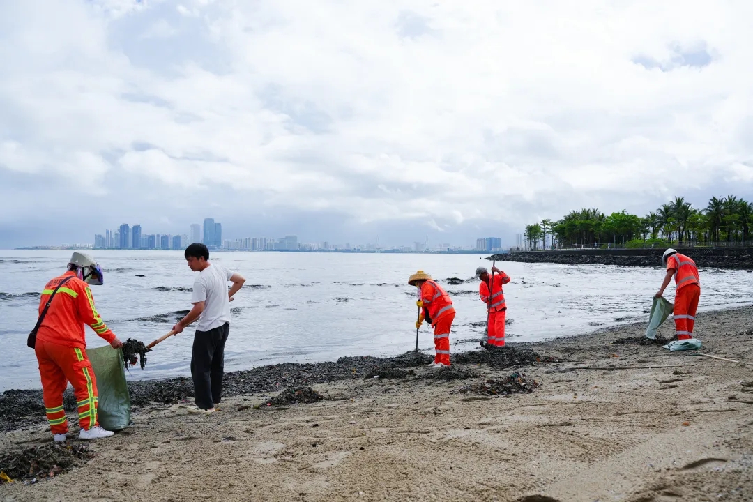 一夜的降雨過后海口灣岸邊被海水沖上岸的垃圾量較為嚴重,第一時間派出應急隊伍參與打撈,盡顯環衛速度。