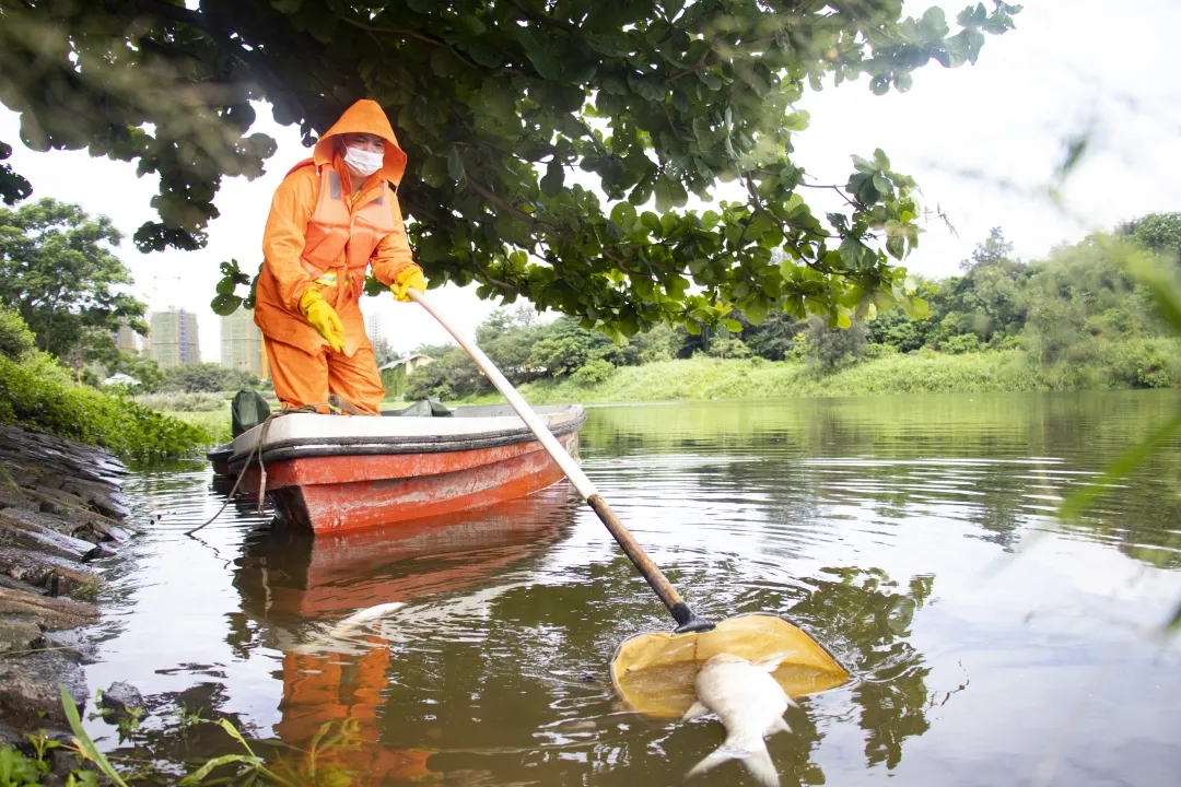 受降雨的影響,東西湖水域岸邊出現大量落葉及漂浮物,片區組織10余名工人,調配2艘打撈船,進行快速打撈,為清晨晨練的市民打造一個優美的晨練環境。