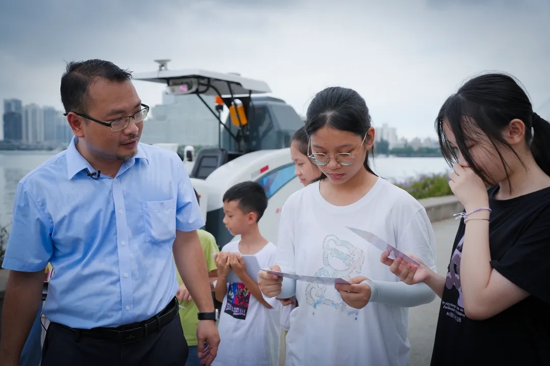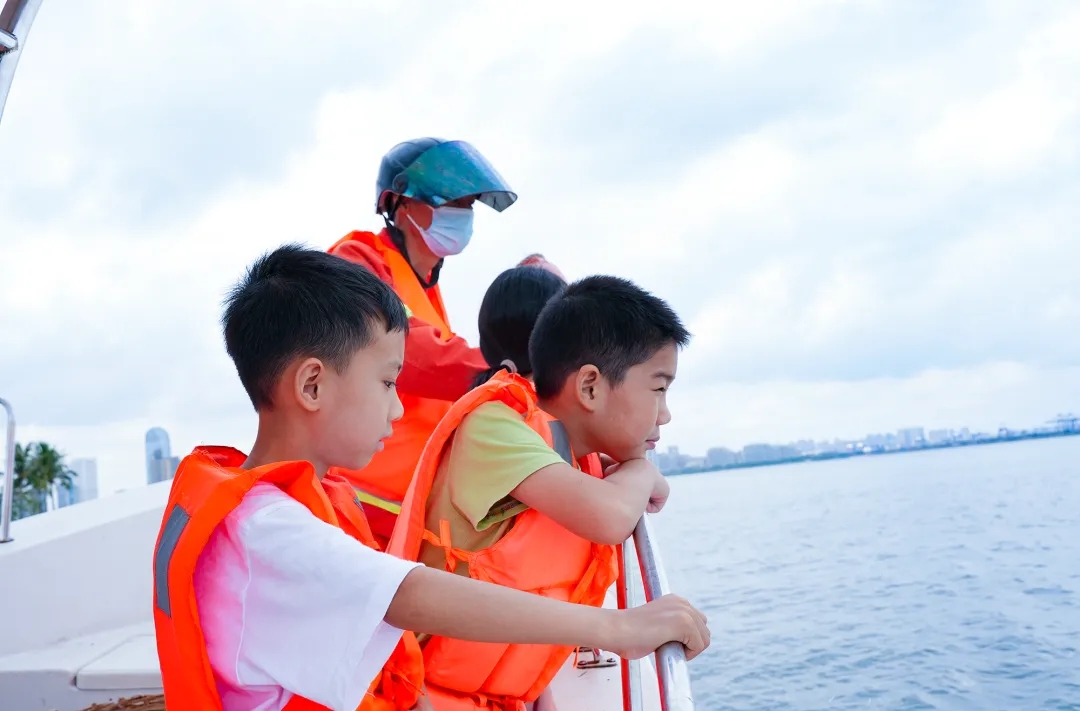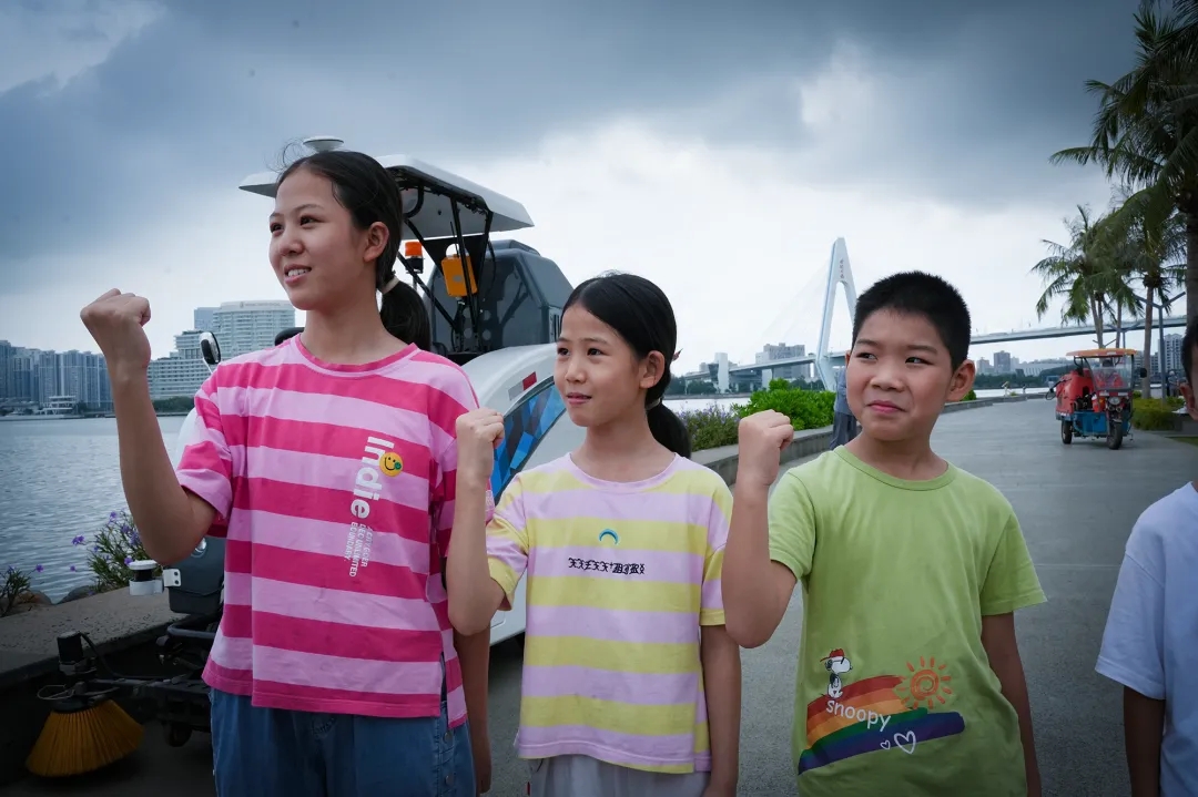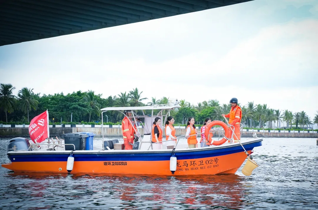 福龍馬海口公司為讓“小小環衛工人”深刻了解水上環衛作業知識,為他們穿好救生衣并登上打撈船深度體驗水上環衛工作。