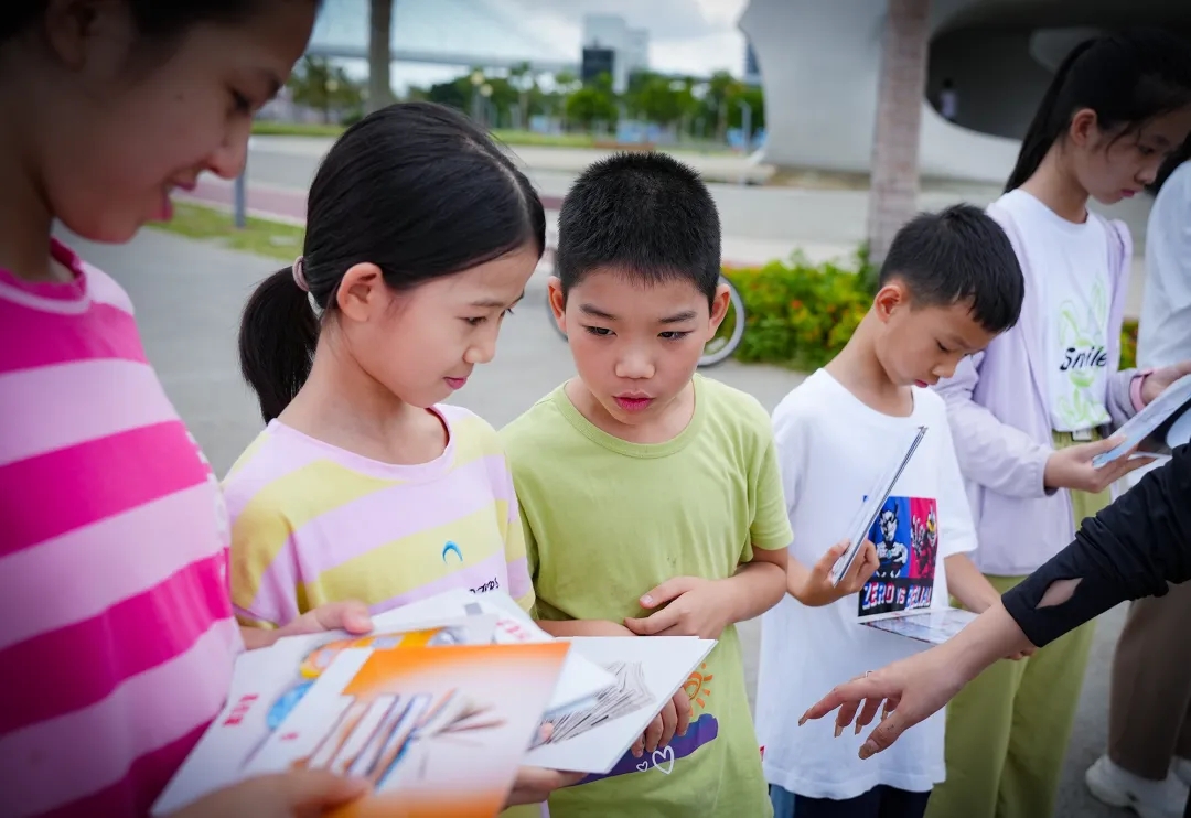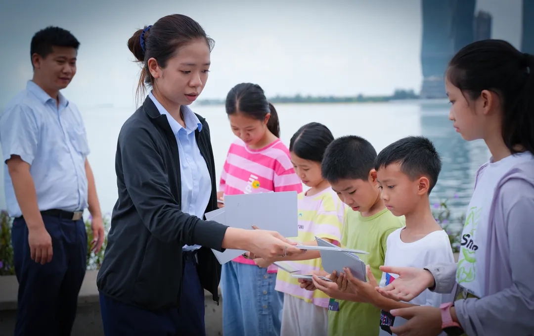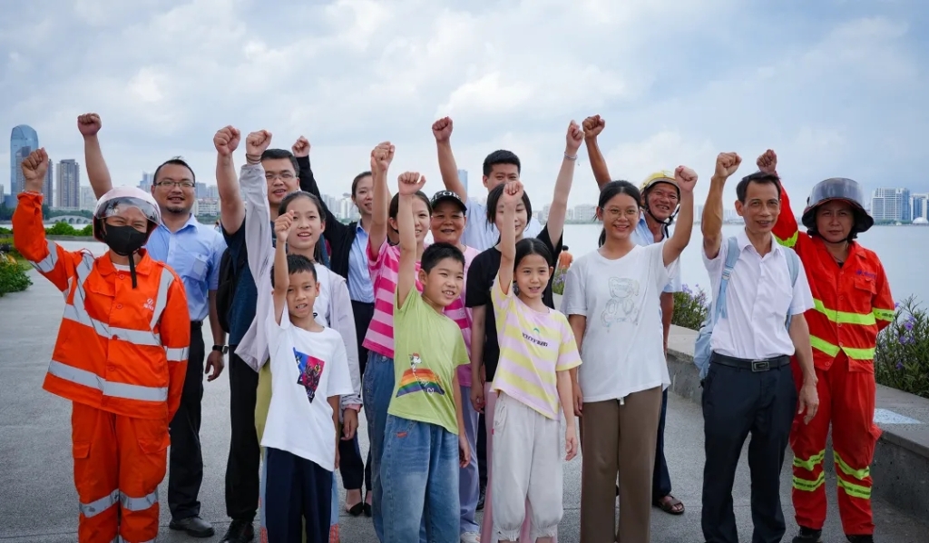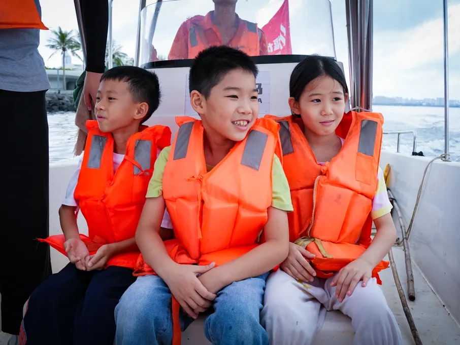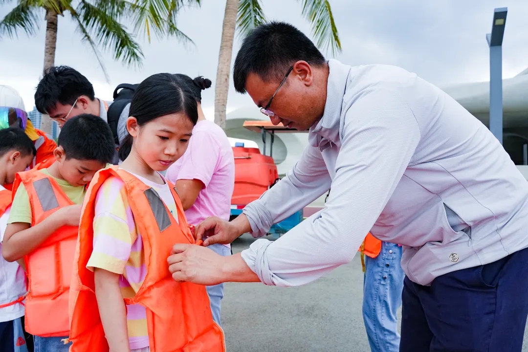福龍馬海口公司為讓“小小環衛工人”深刻了解水上環衛作業知識,為他們穿好救生衣并登上打撈船深度體驗水上環衛工作。