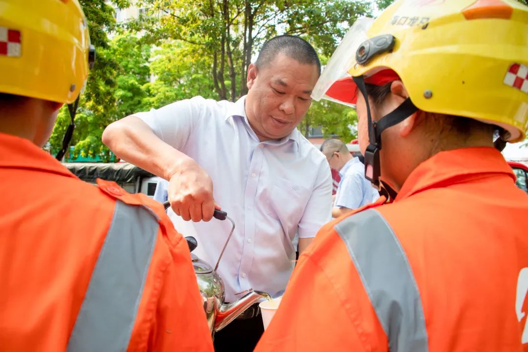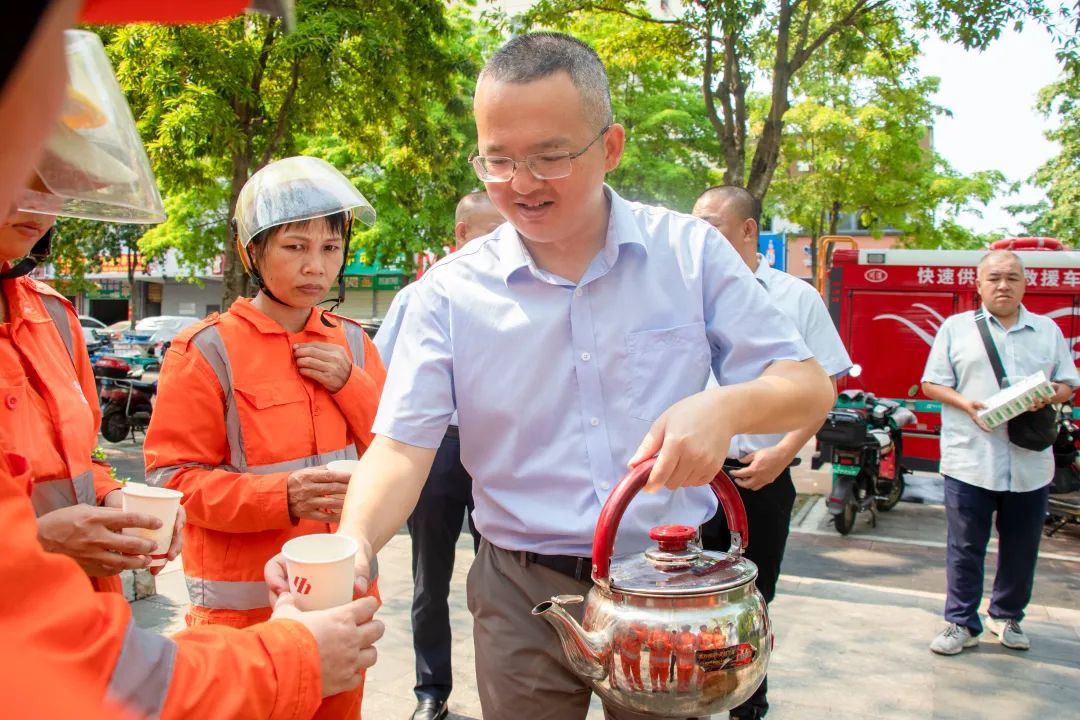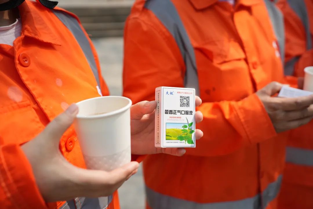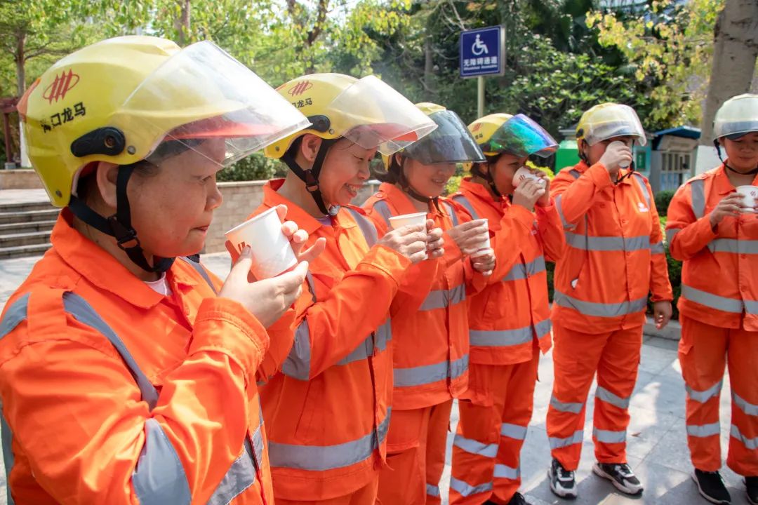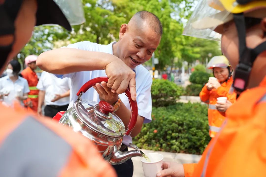 為保障高溫天氣堅持在一線崗位員工的身體健康,公司開展的“夏日送清涼”的活動火熱進行中,清涼降火涼茶、藿香正氣水等清涼飲品及防暑用品接連不斷,如約被送到各員工手中。4月29日,福龍馬??诠究偨浝睃S彪、副總經理楊志剛、工會主席陳偉紛紛下沉各路段為環衛工人發放涼茶、藥品。