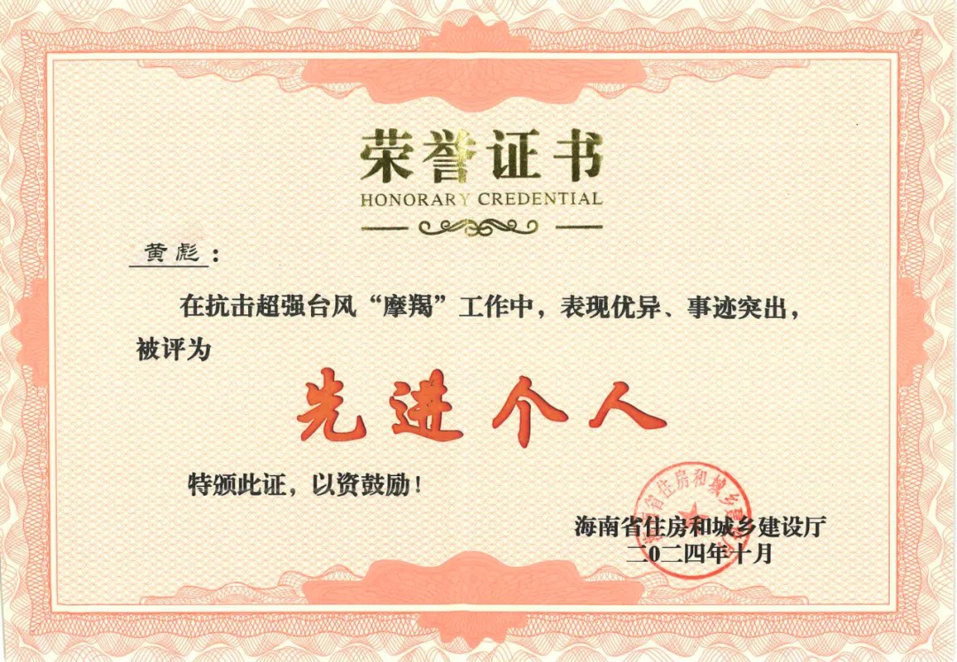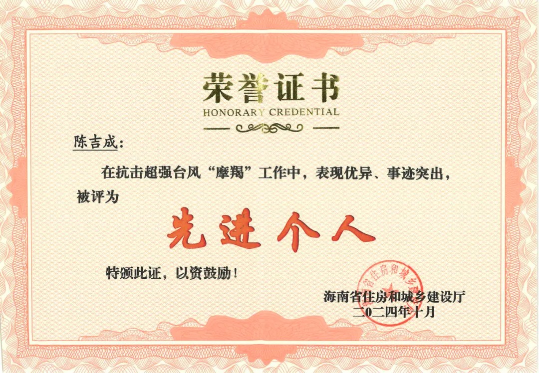 公司積極學習并探索先進安全管理方法,結合實際強化與創新安全工作,榮獲海口市頒發的 2023 年度安全生產先進單位稱號。在抗擊“摩羯”臺風工作中,公司總經理黃彪、片區經理陳吉成獲得海南省住房和城鄉建設廳頒發的抗擊 “摩羯” 臺風先進個人榮譽稱號。公司海域工人勇救落水女子事件被媒體廣泛宣傳,充分展現了公司員工的高尚品德和社會責任感,為社會樹立了正能量標桿。